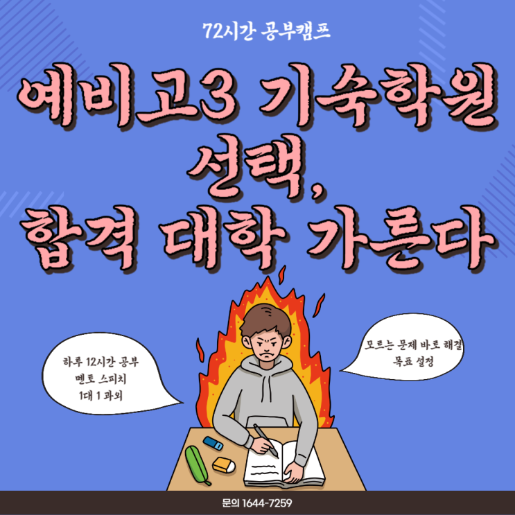 안녕하십니까, 72시간 공부캠프입니다. 이번 포스팅에서는 예비고3 기숙학원 선택을 고민하시는 분들께 유용한 정보를 준비했습니다. 현재 고2, 그러니까 예비고3 학생들은 이번 겨울방학을 누구보다 '잘' 보내야 합니다. 겨울방학은 새학년 새학기를 앞둔 아주 중요한 시기인 만큼 나의 부족한 부분을 보완해야 합니다. 원하는 대학, 학과에 합격하기 위해서는 나를 위한 전략도 수립해야 합니다. 공부도 해야 하고 입시 정보도 알아봐야 하고 이것저것 할 일이 많은데, 사실 혼자 집에서 이 모든 걸 하기란 결코 쉽지가 않습니다. 의지가 흐트러지고, 침대에 눕고 싶고, 공부는 내일로 미루게 되는 것이 현실입니다. 예비고3 기숙학....... <img src="https://blogthumb.pstatic.net/MjAyNTEyMDlfMTY2/MDAxNzY1MjYxNDg4ODgw.luUtArxxVwOX4aErMl5AQ7-YVZb5mEmQzz8jTp3uGG4g.fz3YDBy1rhM-XP0kMzChP0iFHw8iSwWbMf7BMtIq3pcg.PNG/%C1%A6%B8%F1%C0%BB_%C0%D4%B7%C2%C7%D8%C1%D6%BC%BC%BF%E4_-001.png?type=s3" />