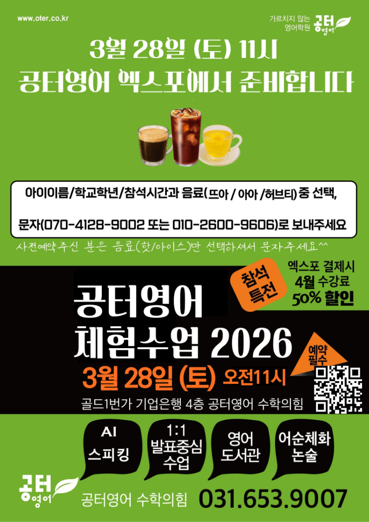 영어의 시작점은 중요합니다!! 언어로 받아들일 것인지, 과목으로 받아들일 것인지 시작점이 저학년일 수록 언어로 받아들이고 스피킹까지 로드맵의 시간이 주어지는데요~ 고학년일수록 입시를 맞 딱들이기에 문법과 롸이팅으로 로드맵이 그려집니다. 어렵지 않게 젖어들수 있도록 우리 아이의 영어 시작점을 앞 당겨 주세요 공터영어 중등으로 올라 간 선배님들을 이어갈 새로운 공터영어 후배님들을 다음과 같이 초대합니다. #공도초등학교#만정초등학교#통번역#공도영어#공터영어#4번째엑스포#공도수학#만정중학교#공도중학교#알파영어#공터영어#수학의힘#끝까지답을찾는다#풀이노트#서술형#논술형#창의력#사고력#너는생각하니?나는쓴다#10분....... <img src="https://blogthumb.pstatic.net/MjAyNjAzMDZfMjIx/MDAxNzcyNzY5MjkwMzMy.bZ01MlN_pcJpWX4vHxL7ShWmKoq4CwsOH5Np5ssBvfsg.Jl0Uy2Tawu5G77DWxx1PdatvS_DMuclp8_K8N3ZDjWog.PNG/%BF%A2%BD%BA%C6%F7_26_1.png?type=s3" />