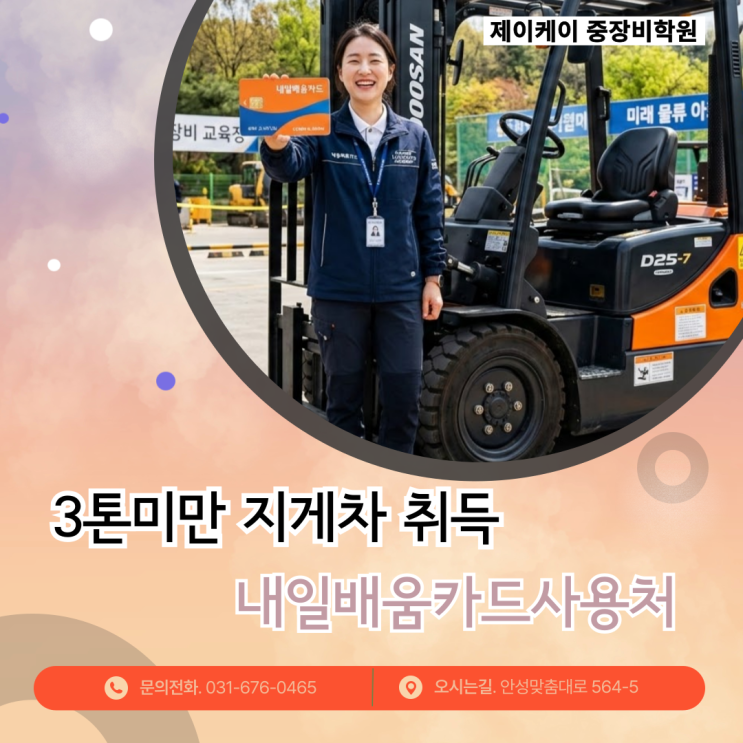 내일배움카드사용처 확인하고 3톤미만 지게차 취득하기 새로운 시작을 준비하기 딱 좋은 따스한 봄날이죠. 요즘 경기가 어렵다 보니 많은 분이 자기 계발이나 재취업을 위해 기술 하나쯤은 배워야겠다고 생각하시는데요. 그래서 오늘은 발품 팔지 않아도 편안하게 수강료 부담은 확 낮추고 2일 만에 이수 가능한 저희 제이케이 중장비학원의 내일배움카드 교육 과정을 여러분들에게 소개해 드리겠습니다. 내일배움카드사용처 확인하고 3톤미만 지게차 취득하기 똑똑한 선택 어디로 가야 할까? 내일배움카드는 누구나 최대 500만 원까지 훈련비를 지원받을 수 있는 아주 유용한 제도이지만 중장비 교육의 경우 단순히 사용처보다 더 중요한 기준이....... <img src="https://blogthumb.pstatic.net/MjAyNjAzMTdfMTgy/MDAxNzczNzM4ODQzMjEx.NLLgwtgnIimNxq-RzvD86Br990Wsr-Sac-C3Bhyk8GMg.VpEG7pRyHuHtnsn3Mzo8cd0kQ5fuCNLROATNajiwhXUg.PNG/%28%BD%E6%B3%D7%C0%CF%29%B3%BB%C0%CF%B9%E8%BF%F2%C4%AB%B5%E5%BB%E7%BF%EB%C3%B3_%C8%AE%C0%CE%C7%CF%B0%ED_3%C5%E6%B9%CC%B8%B8_%C1%F6%B0%D4%C2%F7_%C3%EB%B5%E6%C7%CF%B1%E2.png?type=s3" />