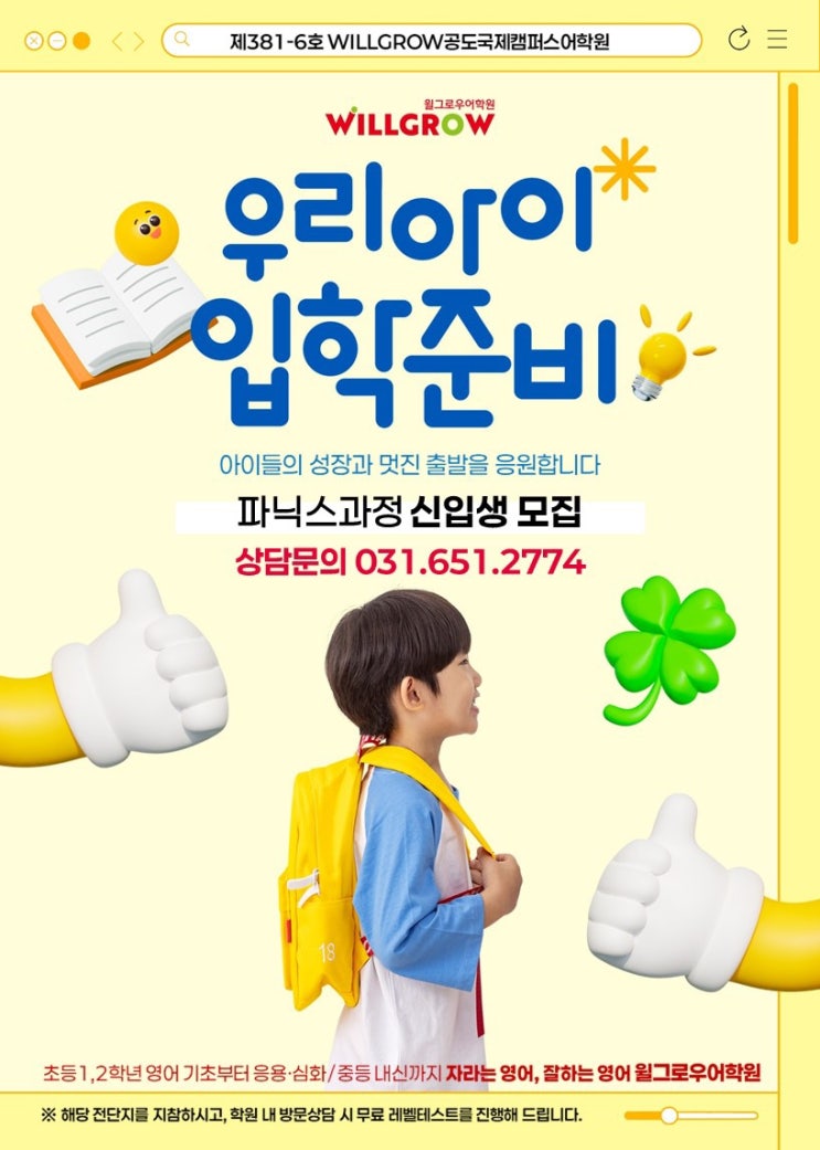 예비 1학년, 2학년부터 시작하는 영어, 왜 중요할까요? 초등 입학을 앞두고 가장 많이 고민하시는 과목, 바로 영어죠. 윌그로우어학원 공도국제캠퍼스에서는 아이들이 학교에 가서 영어가 낯설지 않도록, 기초부터 차근차근 준비하는 입학 준비 수업을 진행하고 있어요 이번에 진행된 원데이 클래스 & 파닉스 수업 살짝 소개해드릴게요! 아이 눈높이에 맞춘 파닉스 & 기초 영어 알파벳 소리부터 단어 읽기까지, 무작정 외우는 영어가 아니라 소리·패턴·이해 중심으로 배우는 수업입니다. 집중도 높은 소수 정원 수업 사진에서도 보이듯, 아이들이 책을 보며 선생님 설명에 집중하는 모습이 인상적이죠? 수업 내....... <img src="https://blogthumb.pstatic.net/MjAyNjAxMjdfMjkg/MDAxNzY5NDk5NTY2MjY5.wVBJjCRwkN5lb8R7dvei-quQ2BZM2xzPAI_f5rKZoFQg.Z-5Ra-3BCoTvrkvSdWhpyHtjf82-nofvN0hdfPijgwsg.JPEG/IMG%A3%DF4482.JPG?type=s3" />
