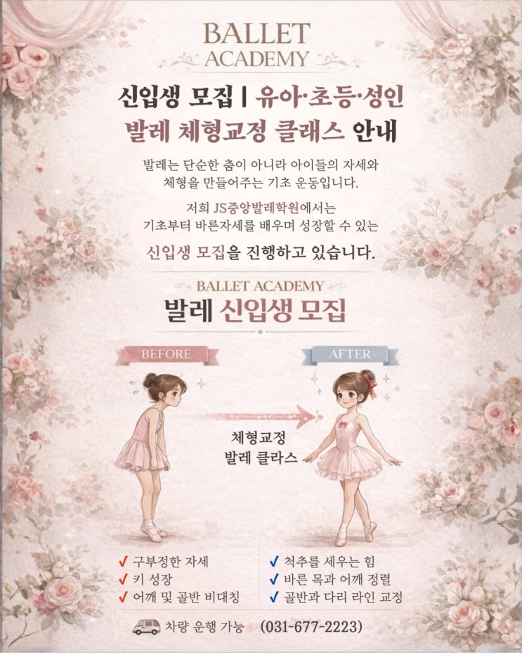 신입생 모집 중✨ 기초부터 차근차근, 아이의 자세 · 라인 · 집중력 · 자신감을 자연스럽게 키워주는 발레 수업 자세한 사항은 상담 및 문의 부탁드립니다 문의) 031-677-2223 <img src="https://blogthumb.pstatic.net/MjAyNjAxMjhfMTgw/MDAxNzY5NTMwNjQ5ODkz.rN-80OgU5_zkGneUKQkpRJk41nj8L7bUaZOx8PUf7Vcg.D9URvNrrj8JEeufMBkdGbvKm6LMOtg3YtPtcHi8pzekg.JPEG/IMG%A3%DF6473.jpg?type=s3" />