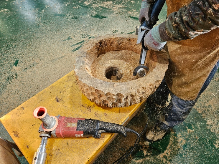 안녕하세요 만파입니다. 할로윈 펌킨 작품의 받침대를 만들려고 준비한 전나무입니다. 삼각커터와 다용도커터로 외부에 텍스쳐를 넣으며 조각하고, 홀스커터로 나무 안쪽 속만 파냈더니 또하나의 작품으로 탄생하였습니다. 받침으로 사용할 용도인데 깎다보니 속에 구멍만 메우면 큰 그릇으로도 사용해되 될거 같습니다. 많은 관심 부탁드립니다. 만파공구 문의 : 010-8777-5735 만파 위치 : 경기도 안성시 양성면 만세로 700-20 #만파 #목공예 #우드카빙 #목공조각기 #통나무홈파기 #취미목공 https://youtu.be/4QTswRxXCU0 <img src="https://blogthumb.pstatic.net/MjAyNTEyMDRfMjQ1/MDAxNzY0ODI3MDg5NDM2.nSBWEoWysD5iRsqp4E0_NgW3sXjFDLINp2B5CrriSZUg.lzANzHnG5NuGVsoU-o0kdbLSHAbeoaHYJHrUQvN72Zog.JPEG/20251202_151226.jpg?type=s3" />