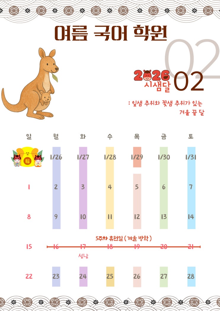 안녕하세요. 장기동 국어 논술 학원 여름;국어입니다 :) (‘여름’은 열매라는 뜻의 옛말입니다.) 2월과 3월 수업일 안내입니다. * 겨울방학 : 2/16(월) ~ 2/21 (토) * 삼일절 대체 공휴일 : 3/2(월) 내가 이해하는 모든 것은 내가 사랑하기 때문에 이해한다. 자세한 사항은 여름국어학원으로 연락 주세요 T. 031-8049-8939 H. 010-9570-7780 <img src="https://blogthumb.pstatic.net/MjAyNjAyMjhfOTEg/MDAxNzcyMjQxNTA4ODI3.oYfLrdEcYwLoW_P1LB8TfIcXvMaHnQE_E2ciAawW-oQg.iucZzcyBYImHzgjN5f3QKPw5i-njAFvWvzDdBLodzgEg.JPEG/2026-%B4%DE%B7%C2-002.jpg?type=s3" />