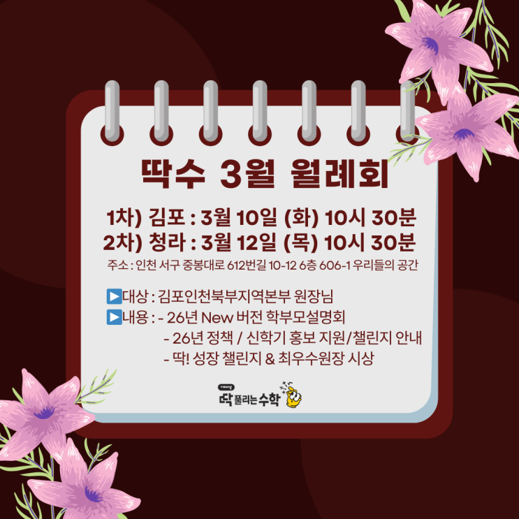 활기찬 새 학기 새 학년을 맞이하여 딱풀리는수학 김포 청라 검단 부평 원장님들과 3월 월례회 모임을 가졌어요. 오전 모임 후 원활한 오후 수업 준비를 위해 김포와 청라에서 각각 2회 나누어 월례회를 진행했어요. 1차 : 3월 10일 (화) 김포 2차 : 3월 12일 (목) 청라 1차 모임 (김포) 신입 원장님의 인사 소개가 있었어요. 딱풀리는수학과 함께 딱풀리는수학 고촌초점 환영합니다. 3월 21일 (토) 10시 30분 학부모 설명회를 진행합니다. 선착순 10명 한 달 무료 수강권 제공! 파격적인 혜택이네요. 고촌 학부모님들 어서 신청해 주세요 아래 클릭하여 설명회 자세히 보기⬇️⬇️⬇️ 원장님들의 성장과 함께 하는 딱풀리는수학! 신학기에....... <img src="https://blogthumb.pstatic.net/MjAyNjAzMTVfMTg3/MDAxNzczNTM5MTU0OTU2.KxfsKSrwWCch3Xy-w9ZOX9nujf_qgu_5r3zKgVcJ_BIg.z6FrNAamjW6MQzVrqY4ctpMqBOQwntg2Lyw3DqLji_kg.PNG/3%BF%F9%B8%F0%C0%D3_%B5%FC%BC%F6_%281%29.png?type=s3" />