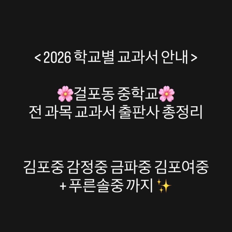안녕하세요 - 걸포동 더영어, 더수학 원장 카트리나 입니다. 오늘은 매년 꾸준히 진행중인 걸포동 근처 중학교의 전과목 교과서 각 학년별 출판사 총정리 포스팅입니다! 김포중학교 교과서 출판사 1학년 영어: 천재 소영순 2학년 영어: 천재 소영순 3학년 영어: 능률 김성곤 1학년 수학: 미래엔 2학년 수학: 미래엔 3학년 수학: 신사고 감정중학교 교과서 출판사 1학년 영어: YBM 박준언 2학년 영어: YBM 박준언 3학년 영어: 동아 윤정미 1학년 수학: 동아 강 2학년 수학: 동아 강 3학년 수학: 미래엔 금파중학교 교과서 출판사 1학년 영어: 천재 이상기 2학년 영어: 천재 이상기 3학년 영어: 천재 이재영 1학년 수학: 미래엔 2학년 수학: 미래엔....... <img src="https://blogthumb.pstatic.net/MjAyNjAzMTJfMzAg/MDAxNzczMjkwNDU4MTEz.v2S8CinAsLZPeFs32ixSGmmBBw9rUHTwXsTYeGjWJ_kg.ZTwwDUYhJ7zwtlOMPkeGCjpub5XiuYZwBCQ68qRtj8Yg.JPEG/output%A3%DF3002100348.jpg?type=s3" />