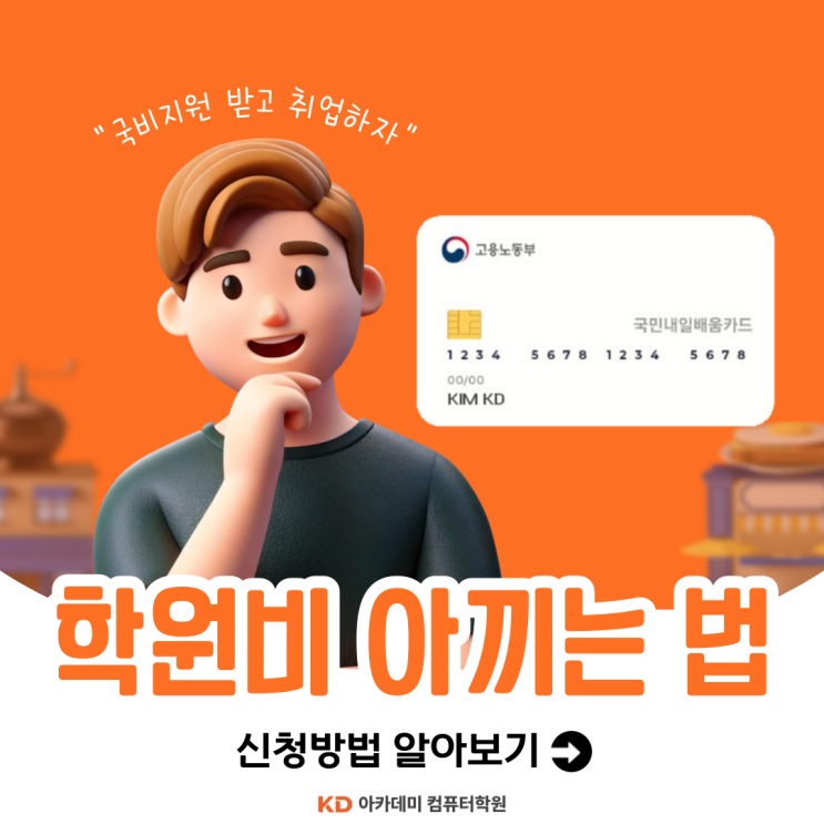 안녕하세요 KD아카데미 컴퓨터 김포점입니다! 취업 준비나 자기계발하고 싶은데 수강비 보고 포기하신 적 있으신가요? 요즘은 강의 하나에 수십만 원은 기본이라 선뜻 시작하기가 참 어렵죠... 그런데 아직도 모르는 분들이 많더라고요 국가에서 1인당 300~500만 원까지 교육비를 지원해준다는 사실! 바로 국민내일배움카드 입니다. 과정에 따라 본인 부담금이 발생하지만 일반 학원비의 일부분만 내고도 교육을 받을 수 있습니다. 게다가 성실하게 출석하면 매달 최대 100만원의 훈련장려금까지 받을 수 있는 과정도 있어 학업에 집중할 수 있습니다! 지금부터 학원비 지원 받을 수 있는 방법 자세하게 안내드릴게요~ 내일배움카드는 어떻게 신....... <img src="https://blogthumb.pstatic.net/MjAyNjAzMTFfMzAw/MDAxNzczMjE5MTA4NTAz.pUE8M5PO41CRm9mkQm-VTF8YHfHMKKIJdI5a2NB7tesg.l7yGk1O1M_G6EOfRWf-sUatuBz5yp-Winn1Gl8h0aBEg.PNG/%C1%A6%B8%F1%C0%BB-%C0%D4%B7%C2%C7%D8%C1%D6%BC%BC%BF%E4_-001_%2810%29.png?type=s3" />