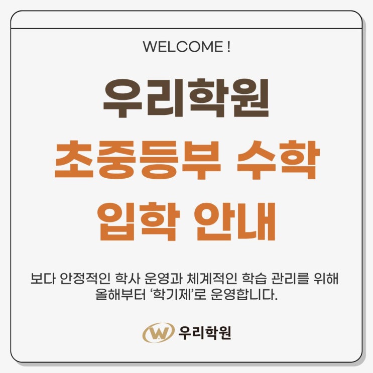 안녕하세요. 우리학원입니다. 우리학원 초·중등부 수학은 보다 안정적인 학사 운영과 체계적인 학습 관리를 위해 올해부터 ‘학기제’로 운영합니다. 우리학원 학기는 다음과 같이 운영됩니다. 봄학기 : 3월 ~ 5월 여름학기 : 6월 ~ 8월 가을학기 : 9월 ~ 11월 겨울학기 : 12월 ~ 2월 학기 단위로 진도와 교육과정을 운영하기 때문에 봄학기 등록 마감은 3월 14일(토)까지입니다. 학기제 운영의 가장 큰 장점은 학생의 실력에 맞춰 진도를 유연하게 조정할 수 있다는 점입니다. 각 반의 진도 계획에 맞춰 수업이 진행되며, 학기 종료 후 월반(상위 과정 이동) 가능 보충이 필요한 경우 같은 과정을 반복하여 기초 보완 이런 방식으로 학생 수준에....... <img src="https://blogthumb.pstatic.net/MjAyNjAzMDhfMjY4/MDAxNzcyOTU3NzIyMDkw.1Ow-aLhn2JWWfu8fXcr7fidGZxVXzUOMIJ6DAErlFP8g.t3YUbikk6it_9PNGE6ZRp9moThzTpv2N8IxaIfsHEdsg.JPEG/%BF%EC%B8%AE%C7%D0%BF%F8_%C3%CA%C1%DF%B5%EE%BA%CE_%BC%F6%C7%D0_%C0%D4%C7%D0_%BE%C8%B3%BB_%BD%E6%B3%D7%C0%CF.jpg?type=s3" />