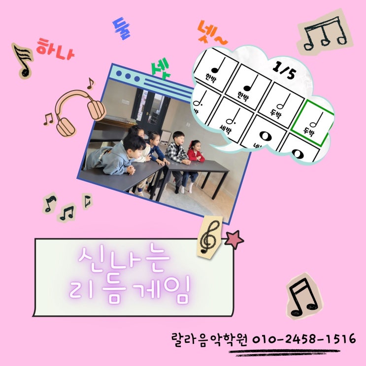 랄라둥이들의 '리듬게임' 수업 현장 안녕하세요~~ 따뜻한 봄기운이 점점 짙어지는 3월이네요~ 요즘은 낮에는 포근하지만 아침, 저녁으로는 아직 쌀쌀한 날씨가 이어지고 있으니 건강 관리에 유의하세요^^ 새로운 시작의 계절인 입학 시즌을 맞아, 아이들의 설렘과 기대가 가득한 시기지요. 요번 특강은 아이들과 신나게 리듬 게임을 시간을 가져보았답니다. 리듬게임을 하는 동안 우리 랄라 친구들은 너무 즐거운 시간을 보냈답니다. 리듬게임이란? 리듬게임은, 단순히 음악에 맞게 이야기를 하는 게 아닙니다. 영상과 함께 음악 용어, 작곡가, 음표, 쉼표에 대해 먼저 알아보고 처음엔 느린 버전과 함께 템포를 조금씩 올려 정확....... <img src="https://blogthumb.pstatic.net/MjAyNjAzMTlfMTQ4/MDAxNzczODgxMDkyMjEy.DZOxHZ7stUXYikArymPaRbJpqm-fsl5e9WSkICy-mpQg.wqGfd1Q0Twe7RIyNpg7yTsQzDwxBAsa8S5uQVpb4AVgg.JPEG/%C7%CF%B3%AA.jpg?type=s3" />
