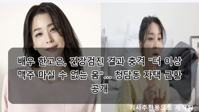 배우 한고은 씨가 최근 건강검진 결과, 예상치 못한 소식을 접하며 식단 관리에 큰 변화를 예고했습니다. 평소 즐기던 맥주를 더 이상 마실 수 없게 되었다는 진단은 많은 이들에게 놀라움을 안겨주었습니다. 프로야구 선수 출신 이대은과 가수 트루디 부부의 집도 공개되어 화제가 되었습니다. "세상 제일 더럽다"는 평가를 받은 이들의 집은 개그우먼 김숙마저 포기하게 만들었다는 후문입니다. 배우 한고은, 건강검진 결과 충격 "더 이상 맥주 마실 수 없는 몸"… 청담동 자택 근황 공개 배우 한고은 씨가 최근 건강검진 결과를 통해 예상치 못한 소식을 접하며 식단 관리에 큰 변화를 예고했습니다. 평소 즐기던 맥주를....... <img src="https://blogthumb.pstatic.net/MjAyNjAzMjBfOTIg/MDAxNzczOTk2MDk5MjA5.jT64-Bi1i7eHBDWxX3rSzUfmefF0qjZAxhuARSQaiXsg.oq-1Pv2mBFErVcXsQ-J6IqEP51clwz0AlvYGu5gkiB0g.PNG/image.png?type=s3" />