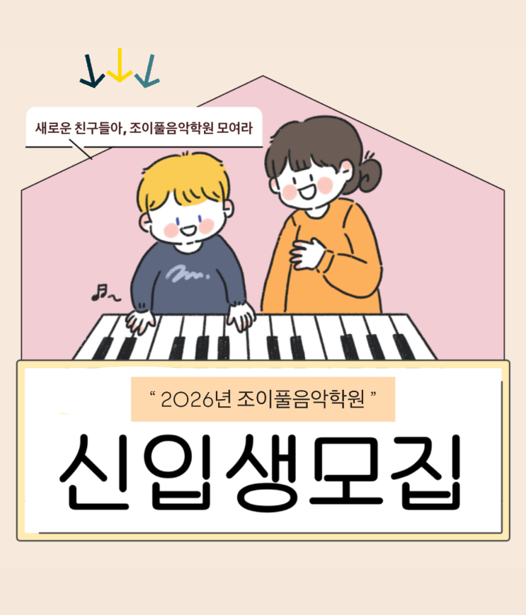 2026년 새학기, 조이풀과 함께할 신입생 모집 합니다 ! ㅡㅡㅡㅡㅡㅡㅡㅡㅡㅡㅡㅡㅡㅡㅡㅡㅡㅡㅡㅡㅡㅡㅡㅡㅡㅡㅡㅡㅡㅡㅡㅡㅡㅡㅡ 조 이 풀 음 악 학 원 ❤︎ JOYFUL MUSIC ACADEMY ❤︎ 항상 진심을 담아, 사랑으로 교육하는 조이풀음악학원 입니다 ▪️모집대상▪️ 유치부 I 초,중,고 I 콩쿨반 I 입시반 I 성인반 I 시니어반 ▪️ 수업 특징 ▪️ ✔️원장선생님의 1:1 맞춤 개인레슨 ✔️타임별 시간정원제&소수정예 수업 ✔️실력있는 젊은 원장님의 체계적인 개인지도 ✔️유치부,초•중•고,콩쿨반,입시,취미반 성인 Class ✔️기초부터 튼튼,전문적인 교육으로 실력 쑥쑥! ✔️음악적 실력과 자신감 향상을 위한 작은연주회 ✔️음....... <img src="https://blogthumb.pstatic.net/MjAyNTExMTdfMjQw/MDAxNzYzMzkwNDQyOTA0.ga54JIsfSMqQLtqwV4fT5BVK-u5ERsxo6SZulmzrsoMg.mWt9s3iQci5ZxZQwV9CY0iwAHEGc8dWMmugOAYwZBvgg.PNG/image.png?type=s3" />
