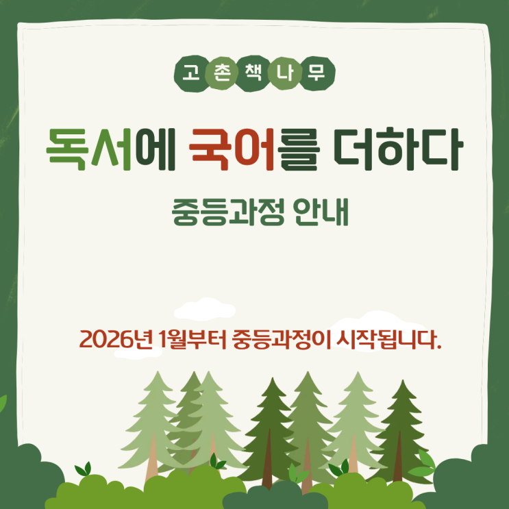 고촌 독서논술, 고촌 논술학원, 고촌 국어학원 안녕하세요! "단 한 명을 위한 맞춤 교육을 하는 곳" 책나무 고촌독서논술학원입니다. 바뀐 교육과정과 입시로 혼란스러운 중고등 생활, 미리 준비하면 흔들리지 않습니다. 고촌 책나무에서는 책나무의 문학과 비문학의 밸런스 독서에 <국어>를 더한 문해력PT 프로그램을 도입했습니다. 고등에서 <국어> 때문에 무너지는 일이 없도록, 탄탄한 <국어>를 향한 여정을 시작합니다. 예비중 <국어>, 지금부터 시작하세요! 책나무 고촌독서논술학원의 상담은 예약제로 진행됩니다. 교육 상담 010-5901-1894 [학교/학년/이름/상담 가능 시간] 문자로 보내 주시면 확인 후....... <img src="https://blogthumb.pstatic.net/MjAyNTExMjdfMjIg/MDAxNzY0MjA1ODI1NTMx.JYvLSSYQ0dUtPDlt9qZMTSwPZl8X4f0XU8J-VTEZt7kg.FZYZp-TRG9Y5AYqNdq6_T6Oj3KOVj8_ZtFdfIZri0O0g.PNG/1.png?type=s3" />