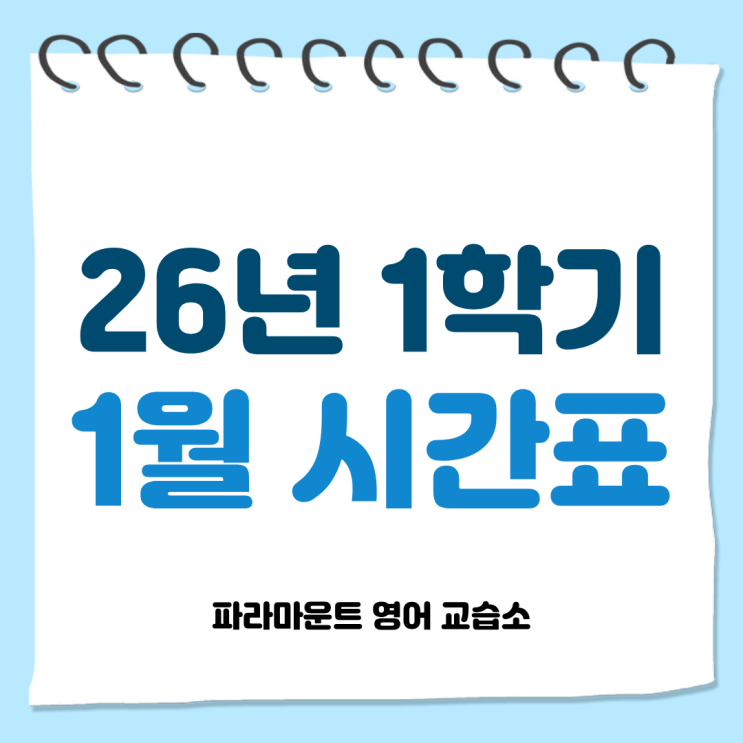 ❄️ 2026년 중등부/고등부 1월 시간표 ❄️ 안녕하세요. 파라마운트 영어 교습소입니다. 2025년 한 해 동안 학원을 믿고 함께해 주신 학생들과 학부모님께 진심으로 감사의 말씀을 드립니다. 다가오는 2026년에도 학생 한 명 한 명의 성장을 최우선으로 생각하며, 성적 향상과 더 책임감 있는 지도, 그리고 체계적인 수업으로 보답하겠습니다. 2025년의 마무리와 2026년의 새로운 출발을 앞두고, 겨울방학 기간 동안 운영되는 2026년 1~2월 방학 시간표를 아래와 같이 안내드리오니 참고 부탁드립니다. :) 클릭시 통화로 이어져요! #파라마운트영어 #파라마운트영어교습소 #운양동영어학원 #운양동영어 #운양동고등영어 #운양동중등영어 #운양동....... <img src="https://blogthumb.pstatic.net/MjAyNTEyMjFfMjcy/MDAxNzY2MzIzMDAwODE1.2XLWIQqLwAYBWniVdiIQb09koqnBMOJXtBjaYRhSh_wg.RIALWRPK08rT-SlyxdaD5rYPuwubmnVE8Ye81N1tzC0g.PNG/1.png?type=s3" />