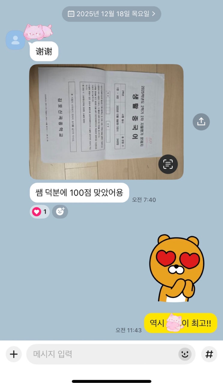 신곡중학교 2학년 리통쉬에가 이번 중국어 기말고사에서 100점을 받았어요! 타 학교에 비해 지필시험이 쉽지 않은 편이었는데, 문제 하나하나를 정말 꼼꼼하게 잘 풀어낸 것 같아요. 시험이라고 해서 따로 봐주거나 특별 대비를 하지 않았는데도, 리통쉬에는 평소 실력 그대로 시험을 치러 이렇게 좋은 성적을 받아서 더 기쁩니다 현재 리통쉬에는 3월 22일 HSK 3급 시험을 목표로 차근차근 준비 중이에요. 이번 방학 동안 기초부터 탄탄하게 다져서 급수 시험에서도 좋은 결과를 기대해 봅니다 ✨ <img src="https://blogthumb.pstatic.net/MjAyNTEyMjJfMjI5/MDAxNzY2Mzc2NDU2MjIy.xYl1aaXiqvoD3lx3j27lp2OncCgXoVZ9Mi9iP2RvTf0g.FA1Qig0EqCy0kcU2fBreWW0P5qNmC-quxobUI7Lg2m0g.JPEG/KakaoTalk_20251222_130441769.jpg?type=s3" />