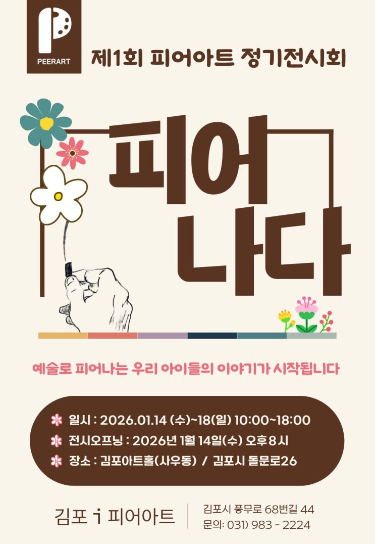 안녕하세요. 함께 피어나는 예술 교육을 꿈꾸는 피어아트 윤샘입니다. 오늘은 조금 특별한 소식을 전해드리려고 해요. 아이들과 매일 그림으로 만나온 시간들이 이제 전시회라는 이름으로 한자리에 모이게 되었습니다. 제1회 피어아트 정기전시회_피어나다 <피어아트>라는 이름이 생기고, 그 이름으로 여는 첫 전시회입니다. 사실 전시회는 이번이 처음은 아닙니다. 그동안 크고 작은 전시부터 야외 전시까지! 저는 우리 아이들과 함께 한 전시회를 지금껏 여덟 차례 진행해왔습니다. (정말... 15년 동안.. 전시회만 해도 추억이 방울방울이네요) 그럼에도 이번 전시를 ‘제1회’라고 부르게 된 데에는 조금 특별한 이유가 있습니다. 이번....... <img src="https://blogthumb.pstatic.net/MjAyNTEyMjhfMjEw/MDAxNzY2OTMwNzY5NDIx.PrRh6IgTzt4mqQsk-KFuESBvid7zPNkrPwzb5v1ObQ0g.Zh96dva99TAjFirT8iWNPxfMP2CZjmCvxTIaPJZlfxQg.JPEG/%28%C0%A5%BF%EB%29_%C7%C7%BE%EE%B3%AA%B4%D9%C0%FC%BD%C3%C8%B8%C6%F7%BD%BA%C5%CD.jpg?type=s3" />