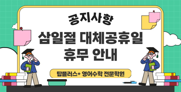 안녕하세요. 탑플러스+ 영어수학 전문학원 입니다. 탑플러스+ 영어수학 전문학원에서는 3월 2일(월) 대체공휴일로 학원 휴무 입니다. 3월 3일(화) 정상수업 진행 합니다. 3월 개학 시간표는 담당 선생님들께서 개별 안내 진행 하십니다. 문의사항이 있으시면 학원으로 연락주시기 바랍니다. <img src="https://blogthumb.pstatic.net/MjAyNjAyMjdfMjQ5/MDAxNzcyMTcxNjg2NTI2.X29B9H2PM49IC0YmkTDptNhm2_w0XdWF0riH4gV3ExUg.zG0dX1GCn_bHSy35xU3uZkWc6BWP3UGp6bsb4ESyaWkg.PNG/%BB%EF%C0%CF%C0%FD%B4%EB%C3%BC%B0%F8%C8%DE%C0%CF%BE%C8%B3%BB_%C5%BE%C7%C3%B7%AF%BD%BA%C7%D0%BF%F8.png?type=s3" />