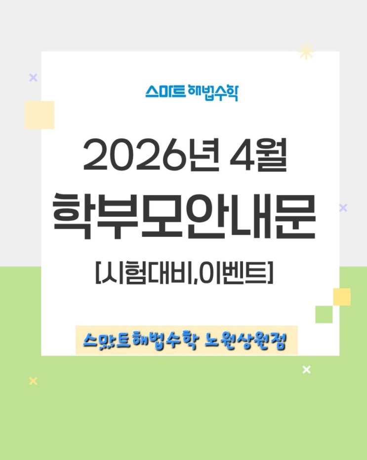 *4월 학부모 안내문* 시험 대비 & 특별 이벤트 소식! 안녕하세요! 스마트해법수학 노원상원점입니다. 어느덧 따스한 봄바람과 함께 4월이 찾아왔습니다. 우리 아이들의 학습 열기도 봄꽃처럼 활짝 피어나는 시기인데요. 이번 달 저희 학원에서 준비한 주요 소식들을 '4월 학부모 안내문'을 전해드립니다. 1. 꼼꼼한 시험 대비의 시작! 4월은 본격적인 시험 대비가 시작되는 중요한 달입니다. * 개별 맞춤 전략: 아이들마다 취약한 단원을 분석하여 빈틈없는 학습 계획을 세웁니다. * 실전 감각 익히기: 다양한 유형의 문제와 기출 분석을 통해 시험 현장에서도 당황하지 않도록 훈련합니다. 2. 동기부여 팍팍! 즐거운 이벤트 공부....... <img src="https://blogthumb.pstatic.net/MjAyNjAzMjdfODQg/MDAxNzc0NTY4MzM5NDk1.g3NZUxFeoGhYk-a0blaV5i-Y6o_6-oo4yJ0LAdlJ3rog.wC5sYz5KtJouhTvxk-Vgv2B3VBC4mnSJJalzfcgVZKog.JPEG/900%A3%DF1774567814506.jpg?type=s3" />