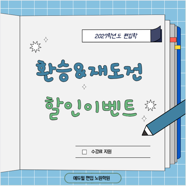 안녕하세요. 에듀윌 #노원편입학원 입니다. 이미 편입을 준비해 본 경험이 있다면 아마 느꼈을 겁니다. 인강이나 타 학원을 통해 공부했지만 원하는 결과까지 이어지지 않는 경우도 생각보다 많다는 것을요 그래서 에듀윌에서는 **다시 도전하는 수험생들을 위한 ‘재도전 & 환승 할인 이벤트’** 를 준비했습니다. 이전의 노력은 그대로 두고 더 좋은 조건으로 다시 시작할 수 있는 기회입니다. 한 번 도전해 본 경험은 분명 큰 자산입니다. 이제는 그 경험을 바탕으로 방향을 다시 잡아볼 차례입니다. 재도전 & 환승 할인 이벤트는 편입을 다시 준비하려는 수험생들이 부담을 줄이고 새로운 마음으로 시작할 수 있도록 마련된 혜택입니....... <img src="https://blogthumb.pstatic.net/MjAyNjAzMDlfMTY1/MDAxNzczMDU2NTE5NzY3.5Ii6-06lr0rIfvJ9U5cP8C219-_DIIoo489N0iKPoZQg.NUXCDNoQ4YNrXfCOJN-iEjhazIEAVXVtKqpRgNpKKc0g.PNG/image.png?type=s3" />