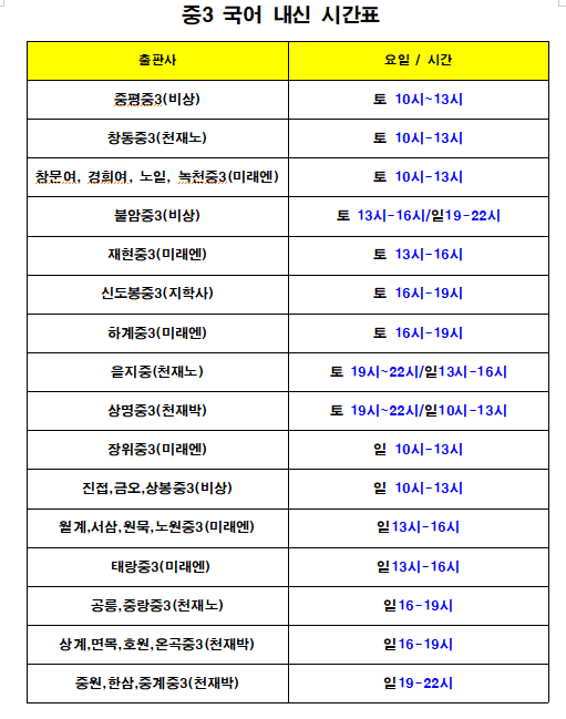 ◈ 중3 수학 시간표 : 황웅준선생님 -개강 : 3/2(월) -시간표 : 월금 17시-20시 ◈ 중3영어 시간표: -담당 강사 : 이보영원장님, 정윤종선생님 -개강 : 3/2(월) -교재 : 각 학교 출판사 <내신 콘서트>, <평가 문제집> / 자체교재 - 시간표 : 화,목요일: 16:30~19:30 90분씩 수업 진행 ◈ 중3 사회/한국사 시간표 : 이동찬T *개강 ; 2/28(토), 3/1(일) *교재 -한국사 : 한끝 역사 2-1 (외부교재) -사회 : 한끝 사회 2-1 (외부교재) *시간표 -한국사 : 토09시, 일11시 -사회 : 토11시, 일09시 ◈ 중3 과학 *토 11시 / 토18시 /김연수T -(15 개정)내공의 힘 3-1 *토 14시/ 이대규T -교재 : (15 개정)내공의 힘 3-1 *일16시/ 유채린T -(1....... <img src="https://blogthumb.pstatic.net/MjAyNjAzMTBfNDYg/MDAxNzczMTM0NjIyMTgx.IqsidQu42BWnJkHxmbqGZS7D3Hyw7TWE25gEZyvOxXsg.-XiR3ZiVuSAVgTXY24rXQJhnOQVVWdBY8V1jMzzVmhgg.PNG/image.png?type=s3" />