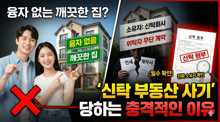 요즘 전월세 집 구하기, 정말 무서우시죠? 최근 블로그에서도 말씀드렸다시피, 전세 수요가 늘어나면서 이와 관련된 이슈들이 끊이지 않고 있습니다. 특히나 연일 터지는 전세사기와 깡통전세 뉴스에, 많은 분들이 "무조건 융자(근저당) 하나도 없는 깨끗한 집만 찾아야겠다!"라고 굳게 결심하시곤 합니다.만 찾아야겠다!"라고 결심하십니다. 하지만, 등기부등본이 백지장처럼 깨끗하다고 해서 무턱대고 계약서에 도장을 찍었다가는 평생 모은 피 같은 보증금을 단 한 푼도 돌려받지 못할 수 있습니다. 바로 깡통전세보다 더 악랄하고 치명적인 '신탁 부동산 사기' 때문입니다. 도대체 신탁 부동산이 뭐길래 이렇게 무....... <img src="https://blogthumb.pstatic.net/MjAyNjAyMjdfMTUw/MDAxNzcyMTcyMzg0MTk5.ZT8cpov5EWWWdX5QruqwsBqG1RKMyMcj-9qjVvRAfCog.VxgiX941A1VhJLr0wNeLnCsxitx3vG7QBpRc3W3rPF4g.PNG/Gemini_Generated_Image_3abw253abw253abw.png?type=s3" />