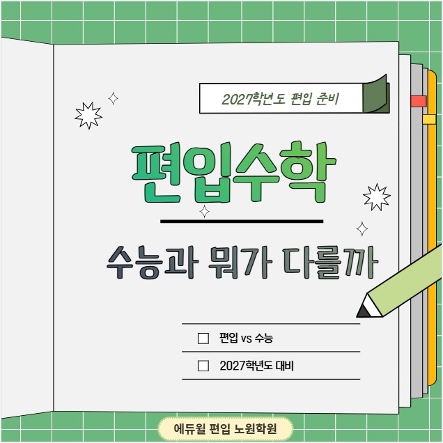 안녕하세요! #에듀윌편입노원 입니다. 2026학년도 편입결과가 모두 발표되었고, 에듀윌 편입 노원학원의 수강생들에 대한 업데이트도 완료되어 합격률 및 명단을 공유해드립니다!! 1개월 이상 장기 결석생을 제외한 자연계 수강생 기준 합격률 77%를 달성했는데요 에듀윌 편입 노원학원이 2027학년도 편입에 도전하는 여러분을 응원합니다! 오늘은 특히 자연계 편입을 준비하려는 분들을 위해 편입수학이 기존에 공부했던 수능과 어떻게 다른지 알아보도록 하겠습니다. 1. 출제 범위 편입수학은 각 대학에서 자체 출제하기 때문에 학교마다 출체 범위 및 구성 비율이 상이합니다. 출제 범위는 크게 네 단원으로 나눌 수 있는데요 커리큘럼 순서대....... <img src="https://blogthumb.pstatic.net/MjAyNjAyMjZfNTEg/MDAxNzcyMTAyNTAzNzEz.iHaJdWk2YELHpC6jIYT5VerGBP5_ZKZvJ5qvX1t3SMog.a5T4nPVN_s3BtgixjZga0E9Cqv9m5_msHJ2QrJoGvsAg.PNG/20260226_171202.png?type=s3" />