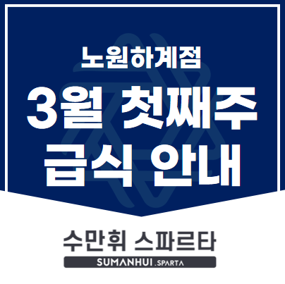 안녕하세요:) 수만휘 스파르타노원점입니다. 2월 넷째주 급식 안내입니다. 메뉴 참고해서 점심, 저녁 신청 부탁드립니다. 궁금한점 있으면 언제든지 문의주세요~ <img src="https://blogthumb.pstatic.net/MjAyNjAzMDFfMTgg/MDAxNzcyMzM5ODc3NDI1.pP75g4WE3rLR1v1KW7kvbWzuDZ7EuZ8vPutfeRzLGYMg.ESPvDVpD_AOhWL6myPeISfgkDB1-foOY9Yb8MnwBYcwg.PNG/image.png?type=s3" />