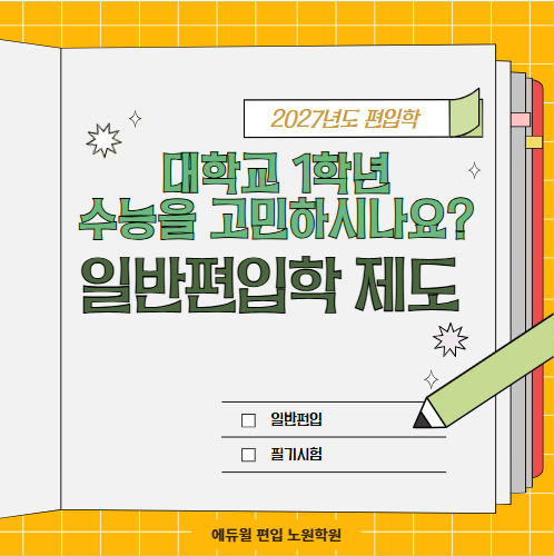 안녕하세요. #에듀윌편입노원학원 입니다. 대학교에 입학한 뒤, 고등학교 때 나름 열심히 준비했음에도 원하던 상위권 대학 진학에 실패해 지금 다니는 학교가 마음에 들지 않아 고민하는 1학년 새내기들을 볼 때면 마음이 쓰입니다. 수능을 다시 볼까 고민해보지만 막상 다시 시작하기엔 부담이 크고, 결국 방향을 잡지 못한 채 방황하는 경우도 많아요. 하지만 현재 다니는 대학에 재학 중이어도 수능에 다시 응시하지 않고 인서울 상위권 대학으로 진학할 수 있는 방법이 있습니다. 그럼에도 불구하고 수능을 선택지로 두고 여러 과목을 다시 준비하느라 힘들어하는 분들이 적지 않죠. 오늘은 이런 고민을 하고 있는 분들을 위해 대학교 일반....... <img src="https://blogthumb.pstatic.net/MjAyNjAxMjZfNzcg/MDAxNzY5NDE2NjYxMTI5.i3VOSI_T8uDGWJeoT6B3FmzuD0jOf6Y8FIal2EtRhJcg.chKVWhGfaDHp5upTabHEqGdfyjc9JDtvrLmyozY-rg4g.PNG/image.png?type=s3" />
