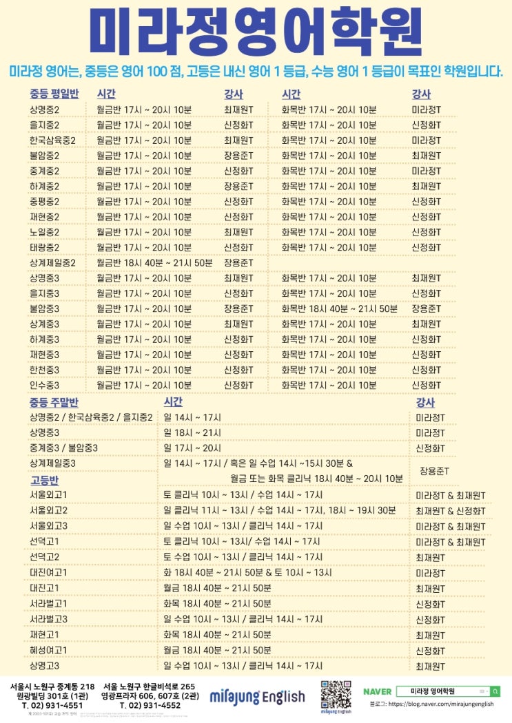 [중계 미라정영어학원]2026학년도 1학기 중간고사 시간표 공지