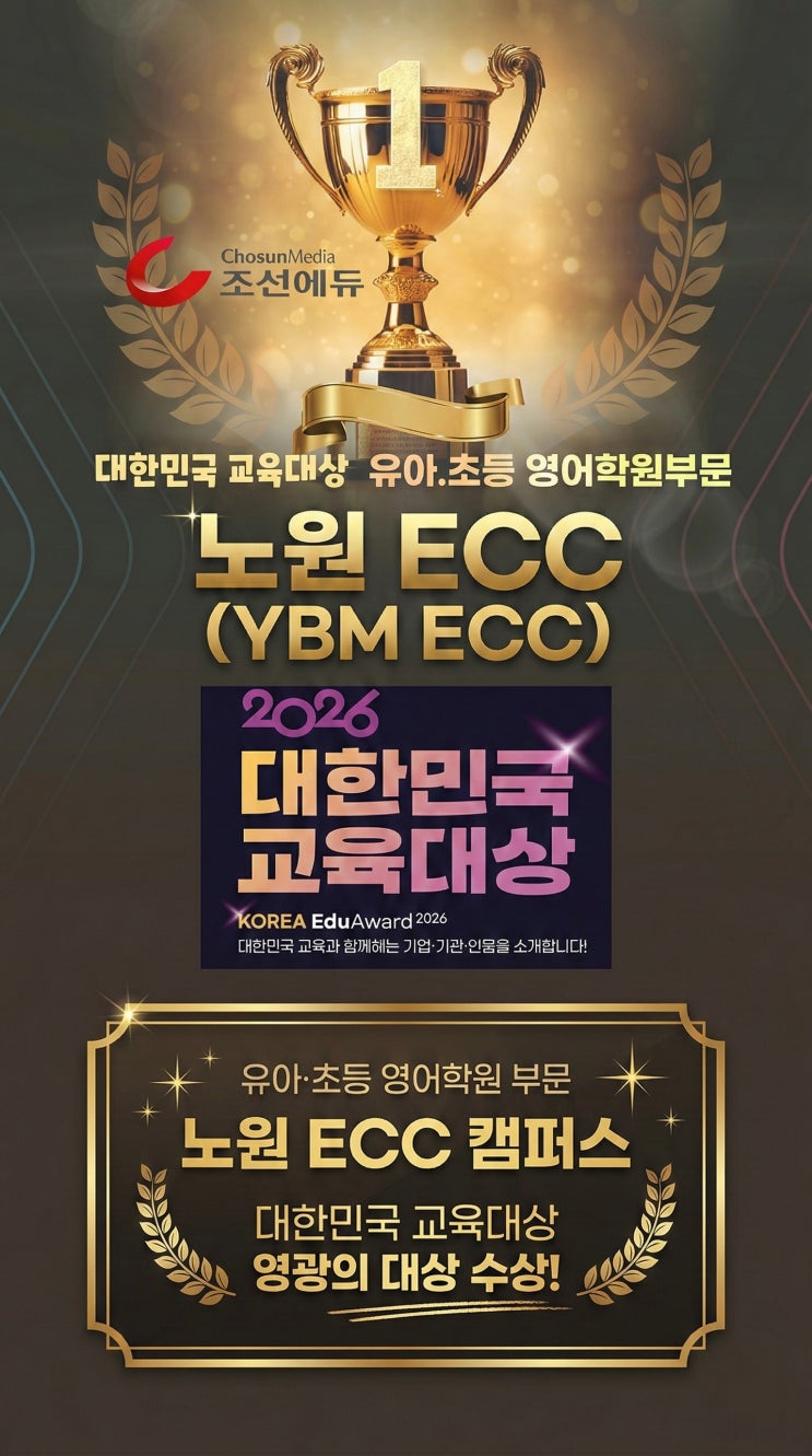 안녕하세요. 노원 YBM ECC입니다. 본격적인 3월 신학기 개강을 앞두고, 노원 ECC의 교육 전문성을 입증하는 객관적인 지표를 하나 더 추가하게 되었습니다. YBM ECC가 조선미디어가 주최하는 ‘2026 대한민국 교육대상’에서 [유아·초등 영어학원 부문] 대상을 수상했습니다. 일관성 있는 커리큘럼: 유치부부터 초등 고학년까지 중단 없는 학습 로드맵을 제시합니다. 검증된 시스템: 단순한 흥미 위주가 아닌, 중계동 학부모님들이 신뢰하는 확실한 학습 아웃풋을 지향합니다. 데이터 기반 관리: 학생 개개인의 성취도를 정밀하게 분석하여 최적의 학습 가이드를 제공합니다. ■ 2026년 3월 신학기 안내 영어유치부 / 영어유치부 졸업반 / 초등부....... <img src="https://blogthumb.pstatic.net/MjAyNjAyMjhfNzQg/MDAxNzcyMjA4NjM1ODI4.UghvqFmQoCkDAqpYhXMCejRKW1Bpuy8nTZIIaejul7og.Xyos03y_dJ0vi-8-qB7jLxmuOP6BAkMRHEnlfHdf5UMg.JPEG/%B1%B3%C0%B0%B4%EB%BB%F3.jpeg?type=s3" />