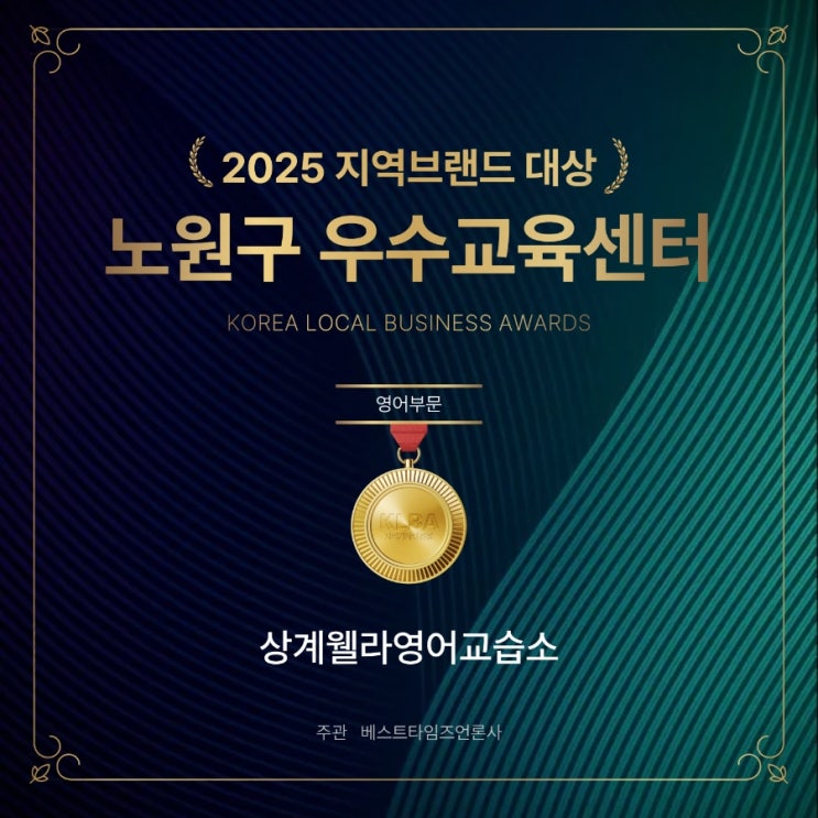 부제: 언론사 '베스트 타임즈'가 주목한 상계웰라영어 이야기 '상계웰라영어교습소, 2025 노원구 우수 영어학원으로 선정...경험하는 영어와 체계적 라이팅 시스템 돋보여' 이는 언론사 베스트타임즈가 지역 우수 사업장을 발굴하는 '2025 로컬 어워즈' 노원구 우수 영어학원으로 상계웰라영어교습소를 선정하며 게시한 기사 타이틀입니다. "안녕하세요. 언론사 베스트 타임즈입니다. 노원구 우수 영어기관으로 선정되어 인터뷰 진행하고자 합니다." 갑작스런 전화에 베스트타임즈를 탐색하기 시작했습니다. 무엇을 기록해야 할건지에 대한 자문의 끝에서 대답보다 '사람'을 보기로 한, 사람....... <img src="https://blogthumb.pstatic.net/MjAyNjAyMjZfMjk5/MDAxNzcyMDM3NDA0MDkz.rhghRuBzv09BbjMvmMLDvj47g0v9_35BXrJN8BReWSUg.t5AeXXLrbnmT1HWUmOvVb1MgWBLltTzTczZNJIpBQfkg.JPEG/900%A3%DF1772036311545.jpg?type=s3" />