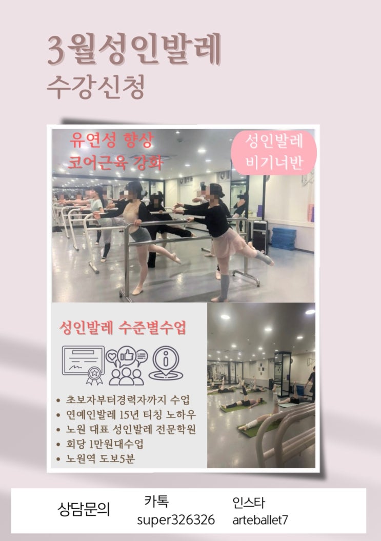 안녕하세요^^ 성인발레전문 아르떼발레 입니다~~ 긴 설연휴 덕분에 근육은 퍼지고 살은 붙고 몸은 게을러 졌어요..wow~~ 한번 게을러진 몸은 한없이 축축 쳐질수 있어요 바른자세교정에 좋은 성인발레 수업으로 빠짝 체형관리 들어가야죵!! 3월 성인발레 수강신청 반별로 티오 몇자리 없어서 달리셔야해요~~ < 2026년 3월 성인취미발레 수강신청 > ▶ 오 전 반 ◀ 비기너반 1 ( 발레 처음배우는분들 원포인트 레슨 ) AM 10 : 30 ~ 11 : 20 까지 화,목 ( 주2회 수업 ) 비기너반 2 ( 발레 처음배우는분들 원포인트 레슨 ) AM 11 : 30 ~ 12 : 20 까지 화,목 ( 주2회 수업 ) ▶ 저 녁 반 ◀ 비기너반 1 ( 발레 처음배우는분들 원포인트 레슨 ) ....... <img src="https://blogthumb.pstatic.net/MjAyNjAyMjBfOTgg/MDAxNzcxNTE0NzgyMTE1.7B9nxZttR3FJ43s-Se_XvHLpiwNs4vjiGgKuZJc69Bsg.M6kjD4eHiyO2ILiuXQGIKrydz0o94Z56qqLtE1_h7lAg.JPEG/BA5303F3-6628-4BBA-A5AD-9DA4A184CDB8.jpeg?type=s3" />