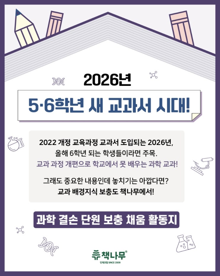 안녕하세요! 책나무 원쌤수학입니다. 2026년부터 적용되는 2022 개정 교육과정으로 인해 현재 초등 5학년(예비 6학년) 학생들의 경우, 교과 과정 개편 과정에서 자칫 놓칠 수 있는 '과학 결손 단원'이 발생하게 됩니다. 우리 아이들이 중등 과학의 기초가 되는 핵심 개념을 놓치지 않도록, 책나무에서 야심 차게 준비한 [과학 결손 단원 보충 채움 활동지] 학습 소식을 전해드립니다! 2026년 새 교과서 시대, 예비 6학년 '과학 공백' 주의보! 교육과정이 바뀌는 시기에는 학년별로 배우는 내용이 이동하면서, 특정 학년은 예전 교과서에서도 안 배우고 새 교과서에서도 배우지 못하는 '학습 결손' 구간이 생....... <img src="https://blogthumb.pstatic.net/MjAyNjAxMTVfODAg/MDAxNzY4NDI3MDkxODE1.-___WRORmXZhrN7TCTXlx2OGZLvjM50iAKYmC62fSLYg.tvMsytqkDQS3Rpl8M3vJO9EGYOTZiHc797VQ1NuV-G8g.JPEG/900%A3%DF1768426435370.jpg?type=s3" />