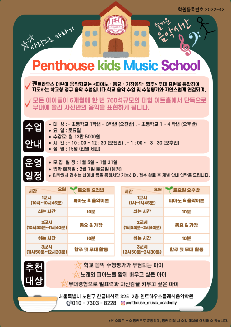 안녕하세요^^* 펜트하우스클래식아카데미입니다. 펜트하우스의 키즈 뮤직스쿨~! 토요 키즈 음악 정규반< Penthouse kids Music School >을 소개해드리려고 합니다!! 아이 음악교육을 고민하다 보면 “피아노만 하기엔 아쉽고, 노래만 하기엔 체계가 부족하고, 무대 경험은 또 따로 찾아야 하나?”라는 생각이 드실 거예요. 펜트하우스 키즈 뮤직스쿨의 토요 키즈 음악 정규반은 이런 고민에서 출발한 수업입니다. ✔ 학교 음악 수업을 그대로 옮겨온 커리큘럼 이 수업은 단순한 취미 수업이나 단기 특강이 아니라, 전 사립초 음악교사 경력을 바탕으로 초등학교 음악 수업 흐름과 수행평가를 자연스럽게 연결하여 학교 수업 흐름과 아이들....... <img src="https://blogthumb.pstatic.net/MjAyNjAxMTZfMjEg/MDAxNzY4NTQyNTc5Mzkw.EFzNxKZw2gqzhbrCdltCtsrX_7fwRL2LvS-24OENXLIg.bgXjjgRqnAH-Y0o-YxJm0zN2GRjQYPgDj1j3sdjiF3Yg.PNG/%C5%E4%BF%E4%B9%DD%BC%F6%C1%A4%BA%BB_%282%29.png?type=s3" />