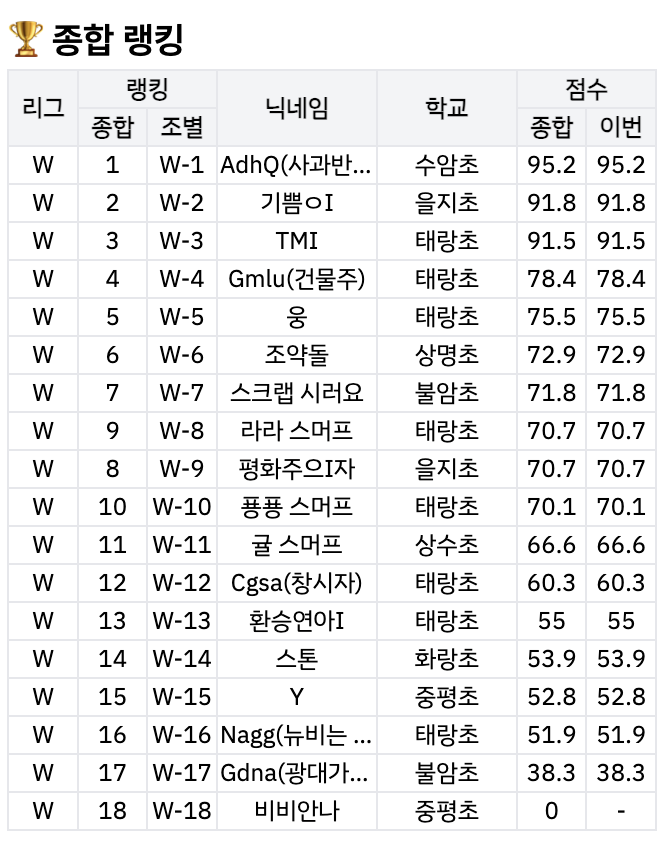 뜨거운 관심속에 1-1과정 월드리그가 종료되었습니다. 그간의 공부를 돌아보며 앞으로의 공부방향에 대한 힌트를 얻었기를 바랍니다. 포인트는 1등부터 5등까지 배분하겠습니다. 모두들 고생 많았습니다~ <img src="https://blogthumb.pstatic.net/MjAyNjAxMjdfMTQ2/MDAxNzY5NTA2MTEzMTQ1.uHqJa5jqYWYRt4n7kARbd_-t1rWbUTwDwx6nMRINl3Yg.NFolBp2bR3LPCoY4blNzSogyyEA4NNJIhXnQd5Evkd8g.PNG/KakaoTalk_20260126_154141926.png?type=s3" />