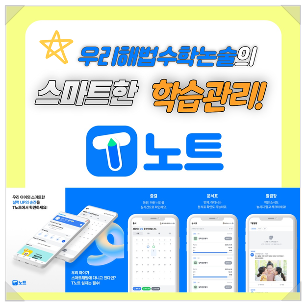 안녕하세요, 관리가 철저한 우리해법수학논술학원입니다. 학원은 당연히 잘 가르쳐야 합니다. 하지만 그것이 전부가 아니라는 건 학부모님들이 더 잘 아시지요? 아이들의 출결부터 학원에서의 학습, 과제 그리고 그 결과까지 잘 관리하는 것이 무엇보다 중요합니다. 쉽지 않지요... 그래서 저희는 스마트해법수학에서 제공하는 확실한 관리 프로그램 "T노트"를 사용하고 있습니다. 우리해법 학부모님들은 100% T노트 어플을 설치하여 사용하고 계십니다. 그럼 지금부터 T노트로 우리 아이들의 학습을 어떻게 관리하는지 알려드릴게요. 잘 살펴보시면 T노트를 더 잘 활용하실 수 있을 거예요. 1. 출결 체크와 동시에 학부모님께 바로 알....... <img src="https://blogthumb.pstatic.net/MjAyNjAzMTFfMzQg/MDAxNzczMjI4MTE5OTA1.JMsV7EFuFu42Z0RumnFmdqfCWXGtz6Sn-P8iROStw7og.amj1Xez5HotNasoTw8O3kUNFkcd2YgTH_Dv2xWdb8jog.PNG/%B4%EB%B9%AE.png?type=s3" />