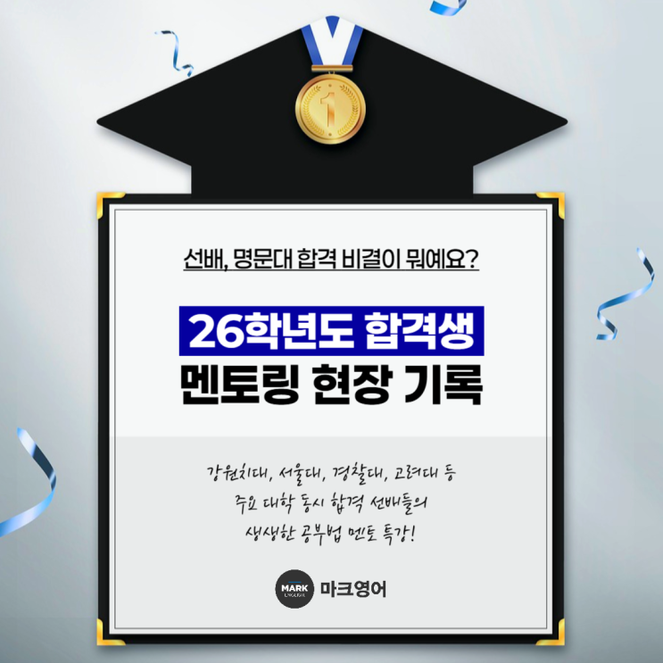안녕하세요 중계동에 위치한 초·중·고 영어 전문학원 Mark English(마크영어)입니다. 저희 마크영어에서는 최근 이번 입시에서 강원치대, 서울대, 경찰대, 고려대 등 주요 대학에 동시 합격한 자랑스러운 졸업생 선배를 초청하여 '재원생 대상 공부법 멘토 특강'을 진행했습니다. 막연했던 입시 공부에 확신을 심어주었던 시간! 우리 학생들이 직접 손으로 쓴 생생한 수강 후기를 통해 그 뜨거웠던 현장의 열기를 전해드립니다. BEST 후기: "공부의 본질과 마인드를 바꾸다" 가장 인상 깊었던 후기들은 단순한 방법론을 넘어 학습 태도의 근본적인 변화를 보여준 것입니다. * 인내의 가치: 인서울 합격자들의 노력....... <img src="https://blogthumb.pstatic.net/MjAyNjAzMDNfNTQg/MDAxNzcyNDk0NDkzODY3.uBxnQk0or0QJfxeAwW_Is11j9SbMJVynoZWEDJzr0BMg.xnRvUu62NwYCwVl7cWCak3WV_9KE_7eahDWnE49s3QEg.PNG/%C1%DF%B0%E8%B5%BF_%BF%B5%BE%EE%C7%D0%BF%F8-001.png?type=s3" />