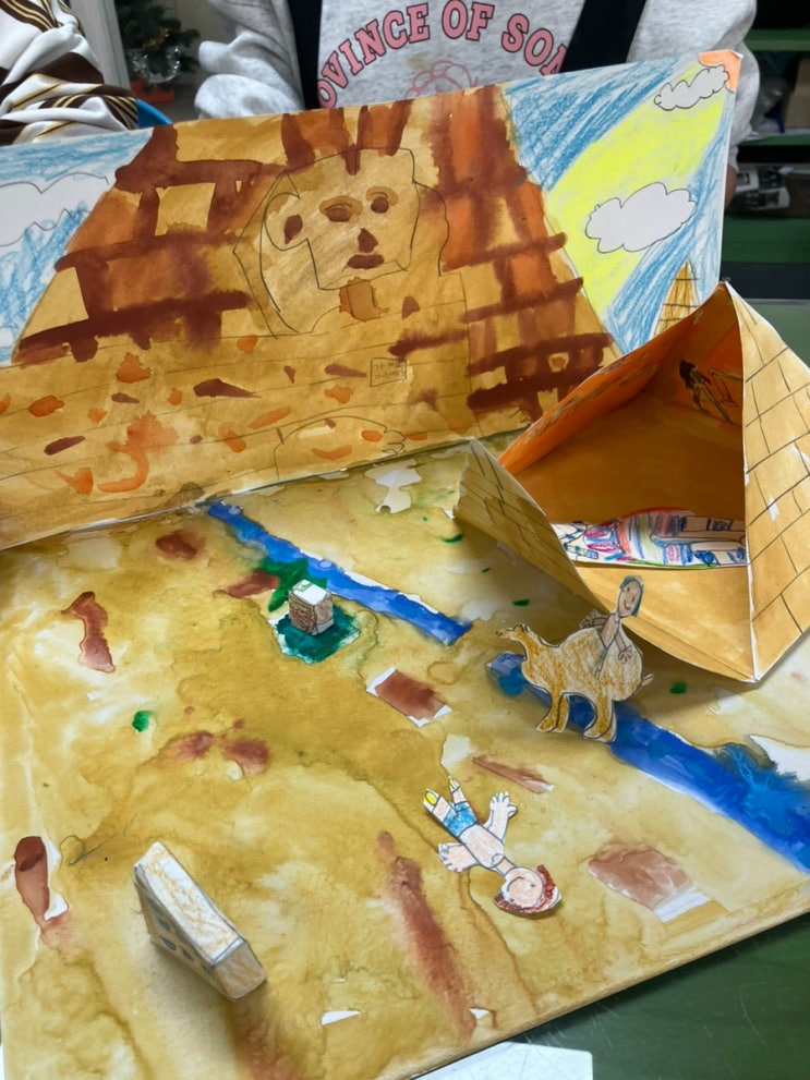 안녕하세요? 컬러풀오아시스입니다. 이집트 피라미드에 관련된 이야기를 나누어보았어요. 흔히들 말하는 피라미드는 이집트 왕족이나 귀족들의 무덤입니다. 물론 남미쪽에서도 피라미드의 형태의 재단 같은 것들이 있긴 합니다. 피라미드는 사각뿔의 형태입니다. 직접 자를 이용해서 그려보았어요. 이집트 사람들은 사후세계에 대해서 아주 중요하게 생각해요. 그래서 무덤이나 미이라 등 죽음과 관련된 의식이 잘 발달 되어있었던 것 같아요. 관의 형태가 사람의 모습과 비슷하다는 것이 신기하고 표현하기가 어려웠던 우리 친구 이집트에서는 미이라를 만들 때 다른 장기는 모두 빼내고 오직 심장만 그대로 두어요. 아누비스가 심장을 저울에 재....... <img src="https://blogthumb.pstatic.net/MjAyNjAyMjhfOTcg/MDAxNzcyMjYwNDM2Mzk5.sfitMeO0t7n1nJ3llPRgSate7z1GGeYSm0Kwg_EbLD8g.YD1k1iwvZEGl2ZeshZvrLkDqvF9W9hbyrKth20FeBRog.JPEG/IMG%A3%DF1651.jpg?type=s3" />