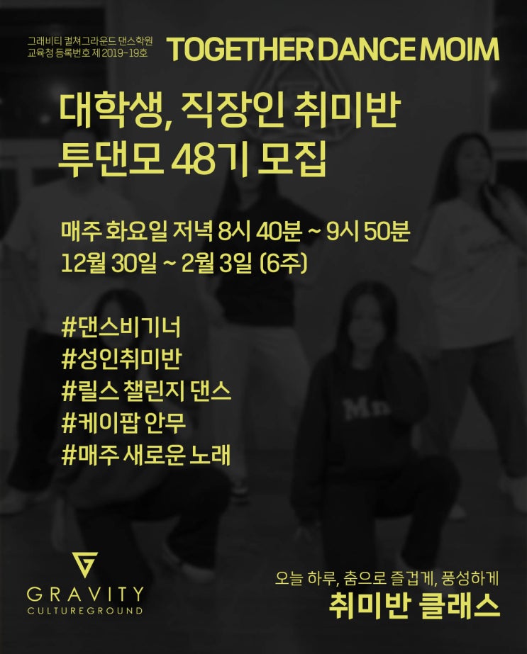 연말을 맞아 새로운 취미, 가볍게 즐길 수 있는 운동을 찾고 계신가요? 노원·공릉 그래비티 컬쳐그라운드에서 성인 취미안무 클래스 **‘투댄모’**가 12월 30일부터 새 시즌으로 오픈합니다 ✨ 투댄모 클래스는 이런 분들께 추천해요 춤을 처음 시작하는 대학생·직장인 실력보다는 재미와 분위기를 중요하게 생각하시는 분 K-POP 안무, 챌린지 댄스를 부담 없이 배우고 싶은 분 운동 겸 취미로 꾸준히 즐길 수 있는 클래스를 찾는 분 춤을 한 번도 배워본 적 없어도 괜찮아요. 투댄모 클래스는 실력과 상관없이 누구나 편하게 참여할 수 있는 성인 취미 맞춤 클래스입니다 ♀️ 시즌 48기 커리큘럼 안내 이번 시즌 투댄모 클....... <img src="https://blogthumb.pstatic.net/MjAyNTEyMTdfMTQx/MDAxNzY1OTY5MjE0MzQ2.toYdthRnr77VTSUTGiCytI8doj67Kivhk0cJHbcpRq0g.QvEPybBAXJZbEKqZN2jGWRoGpJLnUCRB7pHRmiZtyuUg.JPEG/2025_%BB%F3%B9%DD%B1%E2_%C5%F5%B4%ED%B8%F0_%BD%BA%C4%B3%C1%EC_48.jpg?type=s3" />