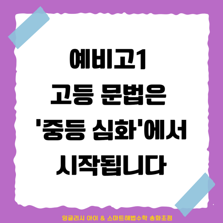 병점중·진안중·안화중 영어,예비고1 고등 문법은 ‘중등 심화’ 에서 시작됩니다 안녕하세요~~ 병점·진안·안화 지역 중학생과 예비고1을 책임지는 잉글리시 아이 송화초점입니다. 1. 예비고1, 왜 지금 ‘문법’이냐고요? 병점중, 진안중, 안화중 학생·학부모님들과 상담을 해보면 이런 말씀을 많이 하세요. “문법은 고등 가서 제대로 하면 안 될까요?” “지금은 내신이 더 급해서, 문법은 나중으로 미루고 있어요.” 하지만 고등 영어 문법은 고1이 되어서 ‘처음부터’ 배우는 과목이 아닙니다. 이미 중2~중3 심화 과정에서 다뤄졌어야 할 내용을 고등에서는 ‘알고 온다’는 전제로 수업이 진행됩니다. 그래서 고등에 올라간 뒤엔 “수업 속....... <img src="https://blogthumb.pstatic.net/MjAyNTExMjVfOTcg/MDAxNzY0MDA0MTcwNjEw.5Dvcs691o2Hu1SeC1iy18SUbrPIMw3zTf6J93aP7xegg.te_9IjSCzTrSFHKqOGCLvnDblBOtjEx7svxQTAgl0o4g.PNG/%BC%DB%C8%AD%C3%CA%C1%A1-011.png?type=s3" />