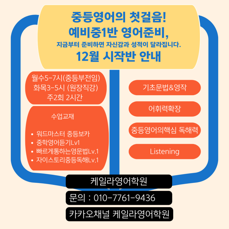 예비중1반 개강안내_ 서연중영어학원, 케일라영어학원