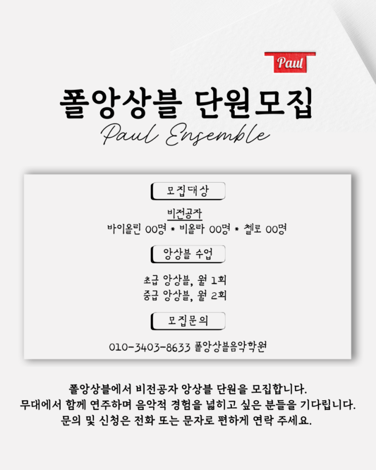 [성인을 위한 비전공자 앙상블] 1. 12월, 1월초 수업일정 1) 초급 : 월 1회 (01월03일 토요일 오전10시) 2) 중급 : 월 2회 (12월13일 토요일 오전 11시) (01월03일 토요일 오전10시) 2. 앙상블 수업비용 : 회당 13,000원 3. 앙상블 단체 회비 : 월 20,000원 (회비의 주된 사용처는 추후 공연대관 비용) <img src="https://blogthumb.pstatic.net/MjAyNTExMzBfMTE3/MDAxNzY0NDMyODYzNTM0.FIVV1fOqsD-s0R70U5xUsLdqHZWgebA4fMrtPbbVe2Mg.9m4t5PUQLI78uexrFgN1P3qnG907NRiabFftUz6mvXYg.PNG/900%A3%DF1764428720739.png?type=s3" />