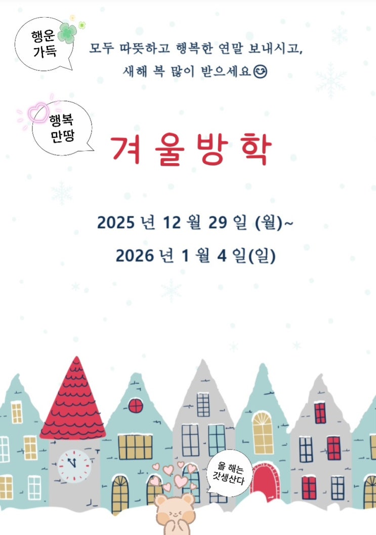 겨울방학 오전 독서 특강 운영 안내 대상 재원생 및 비재원생(신규등록) 기간(방학 중 평일) 청계점 : 1월 5일(월) ~ 2월 27일(금) 반송점 : 1월 5일(월) ~ 2월 27일(금) 청림점 : 1월 7일(수) ~ 2월 27일(금) 목동점 1월 5일(월) ~ 2월 27일(금) (학교별 방학일정에 따라 일정 변경가능) 시간표 <청계점.반송점> 1부 | 09:30 ~ 10:20 2부 | 10:30 ~ 12:20 <청림점.목동점> 1부 | 10:00 ~ 11:20 2부 | 11:30 ~ 12:50 등록방법 20회/30회 선택 ※ 방학기간 내 소화(보강, 이월 없음) ※ 선착순 접수, 입금순 마감 “들어본 아이들은 다음 방학 되면 가장 먼저 신청하는 이유가 있습니다.” 동탄 우리 책나무....... <img src="https://blogthumb.pstatic.net/MjAyNTExMTZfMjg2/MDAxNzYzMjc2MTI3Njk3.1SP3DlAcDobvp0ek21VDXb-ciwjfl9YwObLlHrTs1bgg.F8k-mw9QuhRKI5mM1oxS_o6Ey7gnTKDvn-RU79Y4za4g.PNG/1.png?type=s3" />