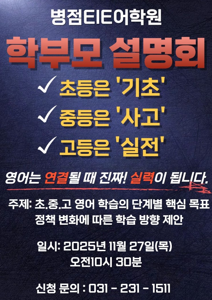 안녕하세요 병점 영어학원 EIE어학원입니다. 2026학년 대학수학능력시험이 끝난 지금 다가오는 새학기를 위한 제대로 된 영어교육의 흐름을 알려드리고자 다가오는 11월 27일에 "초.중.고 영어 학습의 단계별 핵심 목표 정책 변화에 따른 학습 방향"을 주제로 설명회를 있습니다. 설명을 들으시는 것 만으로도 유익한 정보를 얻어 가실 수 있습니다. 초등은 '기초' 중등은 '사고 고등은 '실천' **초등부터 고등까지 연결되는 병점 EIE어학원의 영어교육을 느껴보세요** 선착순으로 진행되오니 빠른 신청 부탁드립니다^^ #병점영어학원 #병점EIE #병점영어교육 #영어교육의흐름 <img src="https://blogthumb.pstatic.net/MjAyNTExMTNfMjg2/MDAxNzYzMDM0ODEyNTk5.n6cby4fKNIZnGrz1KWZx-y-8tgSb87LE2J-rSlKH080g.8rL8ciLeCqRwRrDcipr9jJ0RyNIifGBDVxOWa2n9xokg.JPEG/%BC%B3%B8%ED%C8%B8_%281%29.jpg?type=s3" />