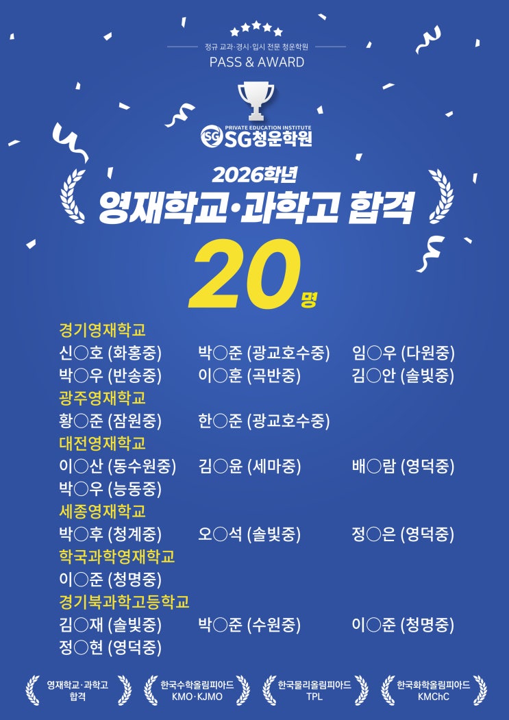 2026학년 영재학교·과학고 합격 :: SG동탄청운학원 안녕하세요 SG청운학원입니다. 올 해에도 우리 원생들의 끝없는 노력과 선생님들의 지도, 학부모님의 관심과 성원으로 다시 한번 영재학교·과학고 입시의 관문을 넘어섰습니다. 그동안의 노력이 아름다운 결실을 맺도록 힘써주신 모든 분들께 감사드리며, 올 한해 완벽한 마무리와 새로운 출발을 위해 항상 힘쓰겠습니다. 감사합니다. 비교불가! 절대강자! SG동탄청운학원이었습니다. 언제든 문의주시기 바랍니다. 감사합니다. 동탄청운학원 제3043호 초등 수강료 분당 213원 / 중등 수강료 분당 224원 / 고등 수강료 분당 234원 #동탄수학 #화성수학 #동탄과학 #동탄청운학원 #동탄과학 #동탄....... <img src="https://blogthumb.pstatic.net/MjAyNTExMjdfMjA5/MDAxNzY0MjI2NTEwNTk2.hb_ZbvIz6Wkz-VrmUjyOVkjeePtCxPEqWLbSSKKkOuYg.wub7ykf0RwCwkpFPTCGGKkiTBFIsotDtxS6QyKM4_18g.JPEG/%BF%B5%C0%E7%C7%D0%B1%B3%B0%FA%C7%D0%B0%ED%C7%D5%B0%DD%BD%C3%C6%AE%C1%F6%2825.11.27%29.jpg?type=s3" />