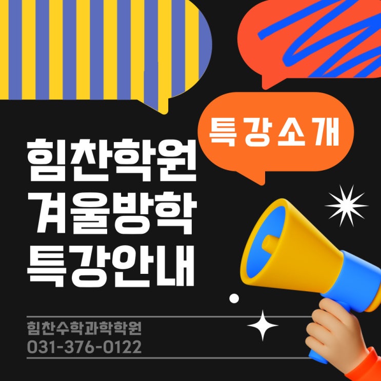두구두구두구!!! 기다리고 기다리던 힘찬 겨울특강 大공개! 안녕하세요. 힘찬수학학원입니다. 지난번! 겨울방학 특강 일정 공개 예고를 했었는데요ㅎㅎ 오늘! 드디어 힘찬 겨울방학특강을 소개합니다! 힘찬수학 겨울특강은 중등,고등 특강으로 진행 될 예정입니다. 우리아이들한테 겨울방학은 정~말 중요한 시기인거 아시죠? 꼭 현재 우리아이 학업에 필요로한 특강을 선택하여 모든 학생들이 알찬 방학생활을 하였으면 좋겠습니다:) 힘찬수학 중등 겨울방학특강 수행평가 실전대비까지 해주는 힘찬 중등 선행특강 (방학동안 힘찬에서 미리미리 함께해요♡) 힘찬특강은 단순히 수업만 쭈우욱 나가는 형식적인 특강이 아닌! 특강전, 우리아이의 현....... <img src="https://blogthumb.pstatic.net/MjAyNTEyMDVfODkg/MDAxNzY0OTI3MjY5MjI5.GtmhQ4qxnjEEimG7EGMk465fYIMxnH1ftuKY_KMbUVMg.DMlQ8MZiDLcVpL8v24P7dYTBzqFuEcryrJ3dJs3H_ikg.JPEG/%B0%DC%BF%EF%B9%E6%C7%D0%C6%AF%B0%AD-%BD%E6%B3%D7%C0%CF_%BA%B9%BB%E7%BA%BB-001.jpg?type=s3" />