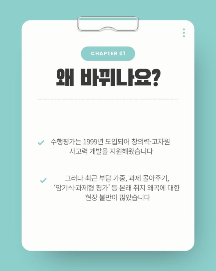 이번 수행평가 제도의 변화에 요지는 다음과 같습니다. 수행평가는 반드시 수업시간 내 실시 암기형·과제형 평가 금지, 활동 중심 평가 강화 시도교육청은 학기 초부터 계획 점검·지도 강화 학생과 학부모의 부담 완화 + 공정한 평가 환경 조성 [출처] 2025년 2학기부터 달라지는 수행평가 방식, 정확하게 이해하셨나요?|작성자 밀레토스 입시학원 <img src="https://blogthumb.pstatic.net/MjAyNTEyMDJfMTk1/MDAxNzY0NjM4NTU2NTAz.yqqrSZoabz3GSmY6QLOCrz5U1-u6tLDxOywPKikALhEg.ZYU9vVxTz8IfN4RWPB86foRmlbWYPj5tEPZB-jd5j_Ig.JPEG/2.jpg?type=s3" />