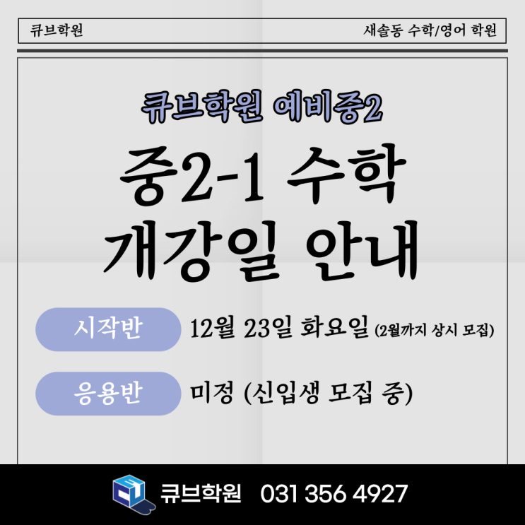 안녕하세요. 큐브학원입니다. 12월 16일 화요일 ~ 12월 18일 목요일에 송린중학교 1학년 2학기 지필평가가 있습니다. 중학생이 되고 보는 첫 학교 시험이니 어색하고 힘들겠지만 마지막까지 최선을 다하여 임하기 바랍니다! 지필평가가 끝나고, 12월 23일 화요일에 예비중2 대상 '중2-1 시작반'이 개강합니다. '중2-1 시작반' 수강 대상 ① 중학교 2학년 1학기 과정을 처음 공부하는 학생 ② 중학교 2학년 1학기 과정을 공부하긴 했지만 다시 시작하고 싶은 학생 '중2-1 시작반' 개강 안내 12월 23일 화요일에 개강하고, 2월까지 상시 모집합니다. 조기에 마감될 수 있습니다. '중2-1 시작반' 학습 목표....... <img src="https://blogthumb.pstatic.net/MjAyNTEyMDVfMjEg/MDAxNzY0ODcxNzE1NTU4.ifjLmroOfourI1dq48jMvszNopeAe-JZQuSdZmfJusUg.IU0RQZDEA9xQqx8yG_eolgbdsvhqIkGAJSBtDGiK0Ewg.PNG/%C1%A6%B8%F1%C0%BB-%C0%D4%B7%C2%C7%D8%C1%D6%BC%BC%BF%E4_-002.png?type=s3" />