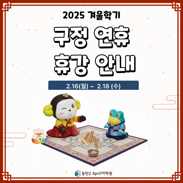 동탄2영어학원 | 동탄2 초등영어 | 동탄2 에이프릴어학원 동탄2 에이프릴어학원 안녕하세요! 동탄2 에이프릴 학생, 학부모님 2026년 구정 연휴 휴강 일정을 안내드립니다. 2/16(월) ~ 2/18(수)은 휴강으로 April 정규 수업이 없습니다. ※ 일정을 미리 확인하시고 수업 참여에 지장이 없도록 당부 드립니다. ※ + 휴강 기간은 레슨 진도에 영향을 주지않으며 수강료에 포함되지 않습니다. + <img src="https://blogthumb.pstatic.net/MjAyNjAyMTBfMjEx/MDAxNzcwNzA3NDU5NjI5.9ws26XTt5s_PlZhUYL4Zz77ZYxlqKUvTFEz4dXY6VTgg.E1F8zGXwKNkDcCHWjr_kgyy52xRHN3vKGlv-KnnTtk0g.PNG/%B1%B8%C1%A4%BF%AC%C8%DE.png?type=s3" />