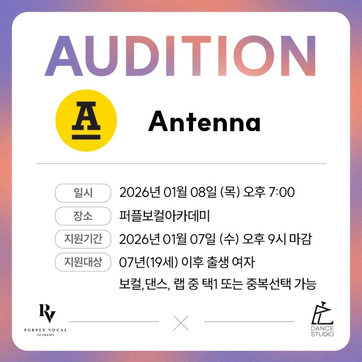 아티스트 유희열, 정재형, 루시드폴, 페퍼톤스, 이서진, 이상순, 이효리, 유재석, 이진아, 정승환, 박새별, 윤석철, 규현 등이 소속되어있는 안테나(Antenna) 내방 오디션 안내드립니다. 일시 2026. 01.08(목) 오후 7시 장소 퍼플보컬아카데미 별관 지원기간 2026.01.07(수) 오후 9시 모집부문 07년생(19세) 이후 출생 여자 보컬, 랩, 댄스 등 중 택1, 또는 중복선택 가능 많은 참여 부탁드립니다! 문의 퍼플보컬아카데미 031)613-3533 경기 화성시 동탄솔빛로 62 리첸프라자 301호 피엘댄스스튜디오 010-7145-7332 경기 화성시 동탄대로 446 7층 7117호 #퍼플보컬아카데미 #퍼플보컬 #퍼플보컬학원 #동탄보컬학원 #동탄실용음악학원 #동탄오디션....... <img src="https://blogthumb.pstatic.net/MjAyNjAxMDVfMjEz/MDAxNzY3NjE4MDc5NTEy.QfQzzv4aNId3860VnW2aj60D1OZJJ05D73NF0ZZ2OdUg.k8yzbeCvyJjHC_SmXct4nxP76KMHFqEpelTcZJ0_bQ8g.JPEG/PVPL%BF%C0%B5%F0%BC%C7%B0%F8%C1%F61_%C0%CE%BD%BA%C5%B8.jpg?type=s3" />