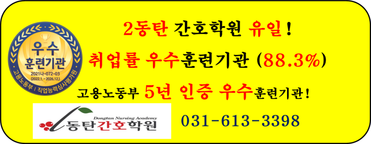 동탄간호학원이 이 번에도 고용노동부 취업률 우수훈련기관에 선정이 되었는데요, 동탄간호학원 취업률 88.3%, 전국 간호학원 평균 78.8%보다 10% 높은 취업률을 보이고 있습니다. 간호조무사 취업 이젠 , 나이, 성별, 지역 걱정하지 마시고 동탄간호학원과 상의 하신다면, 쉽게 평생직업 ! 간호조무사 자격취득으로 원하시는 취업처에 취업하실 수 있습니다. 동탄간호학원 3월 12일과정은 개강일 : 26년 3월 12일 5교시 이론과정으로 첫째, 이론수업이 5교시로 진행됩니다. 9시 20분 시작 ~ 14시 10분 종료 둘째, 실습수업은? 9시 20분 시작 ~ 16시 30분 종료 육아맘, 초등맘님들에게 최적화 과정입니다. 아이들 수업시간과 비슷하게 종료되며, ....... <img src="https://blogthumb.pstatic.net/MjAyNjAxMDZfNDcg/MDAxNzY3NjgxMzA4NzIx.PInQPy-kf-O5rhLMKsYgyfJldIUwnWyQHMETMmiyEkYg.s71QkxpxQzQtIQqxbasa9z0KtTCkm1qOwCKkhi33Disg.PNG/%C3%EB%BE%F7%B7%FC%BF%EC%BC%F6.png?type=s3" />
