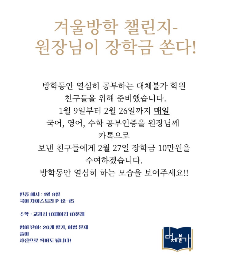 겨울방학입니다. 긴 시간을 의미없이 보내지 않도록 준비했습니다. 무엇이든 꾸준함이 이기는 공부에서 매일매일 원장님에게 국어 , 영어, 수학 공부한 내용을 보내면 조금이라도 괜찮으니 꾸준하고 한결같은 모습을 보이는 대체불가 학생들을 위해 겨울방학이 끝나는 시점에 장학금을 수여하는 챌린지를 시작합니다! 매일매일 국,영, 수 과목을 다들 공부하자나요? ^^ 했다는 표시를 원장님께 해주세요!! 근사한 대체불가 학생들의 챌린지를 진심으로 응원합니다! <img src="https://blogthumb.pstatic.net/MjAyNjAxMDlfMjg2/MDAxNzY3OTU2NDc1MDM4.7LvsWqEw9Av0PwZBK1Peqz35B4OwwwYdg0aiv5O20FUg.pdddRWWPs9o0c45osDVX-lYAblqpDSfvh04lJ8E8SCMg.JPEG/%B0%DC%BF%EF%B9%E6%C7%D0_%C3%A7%B8%B0%C1%F6.jpg?type=s3" />